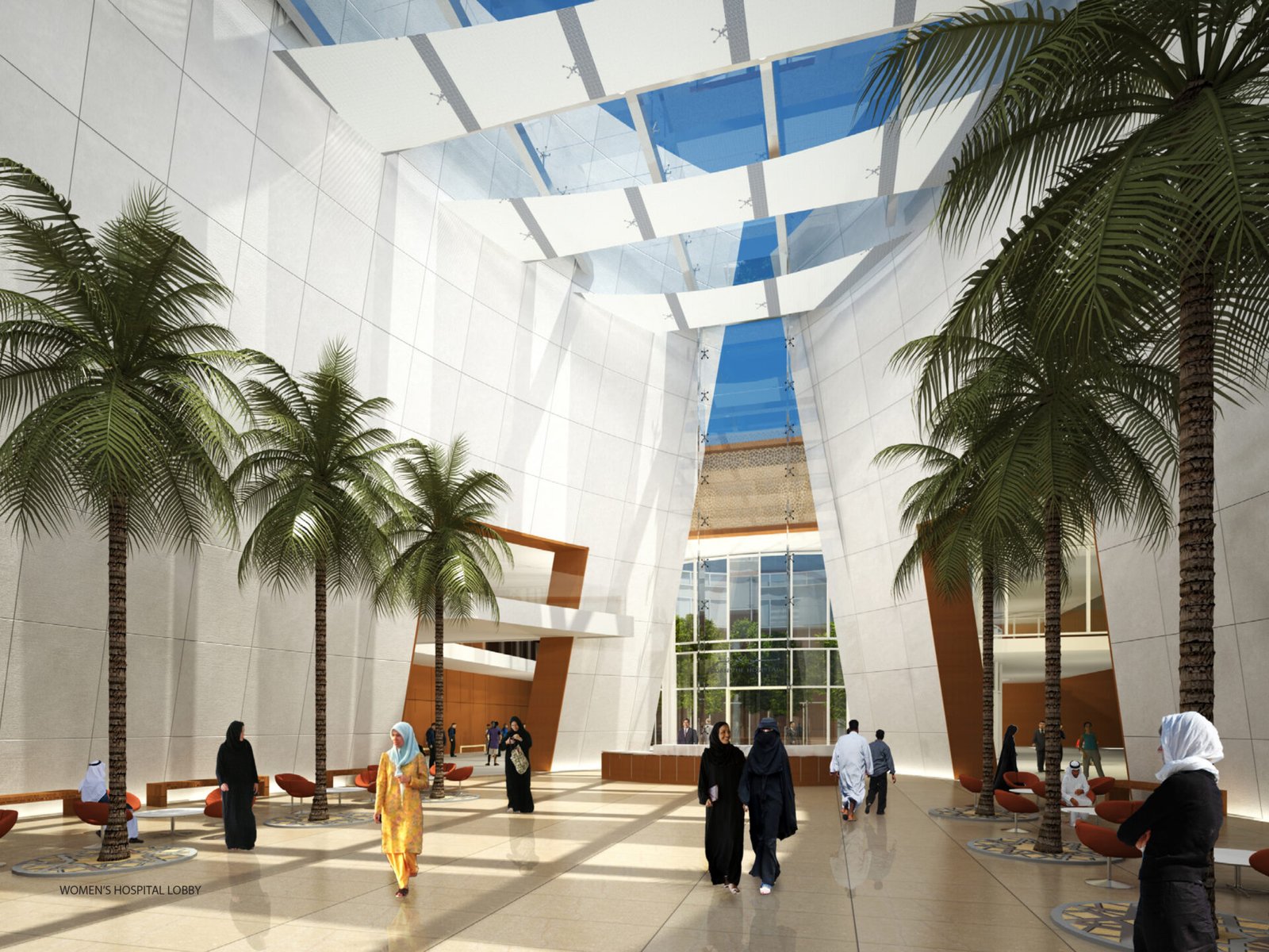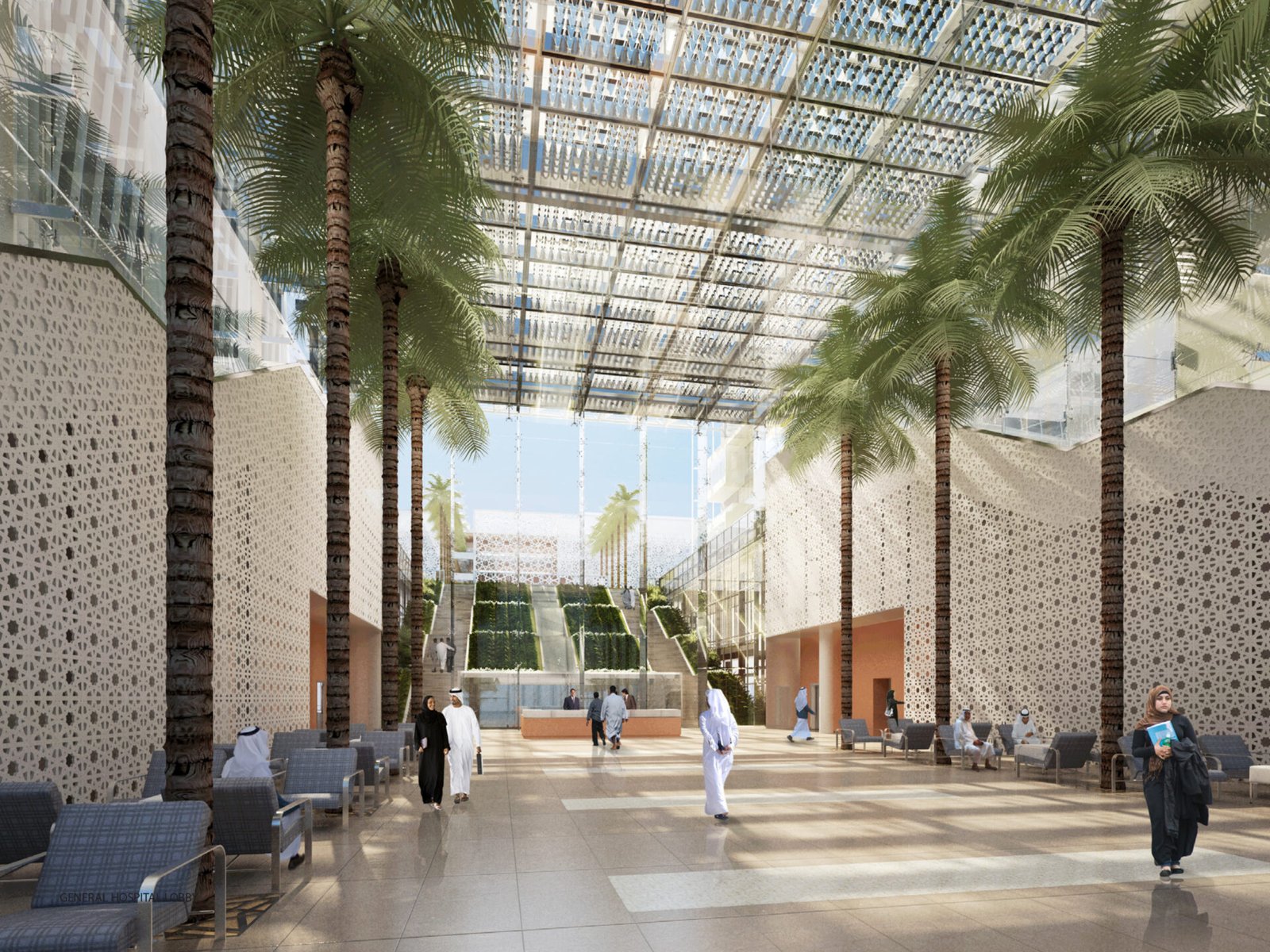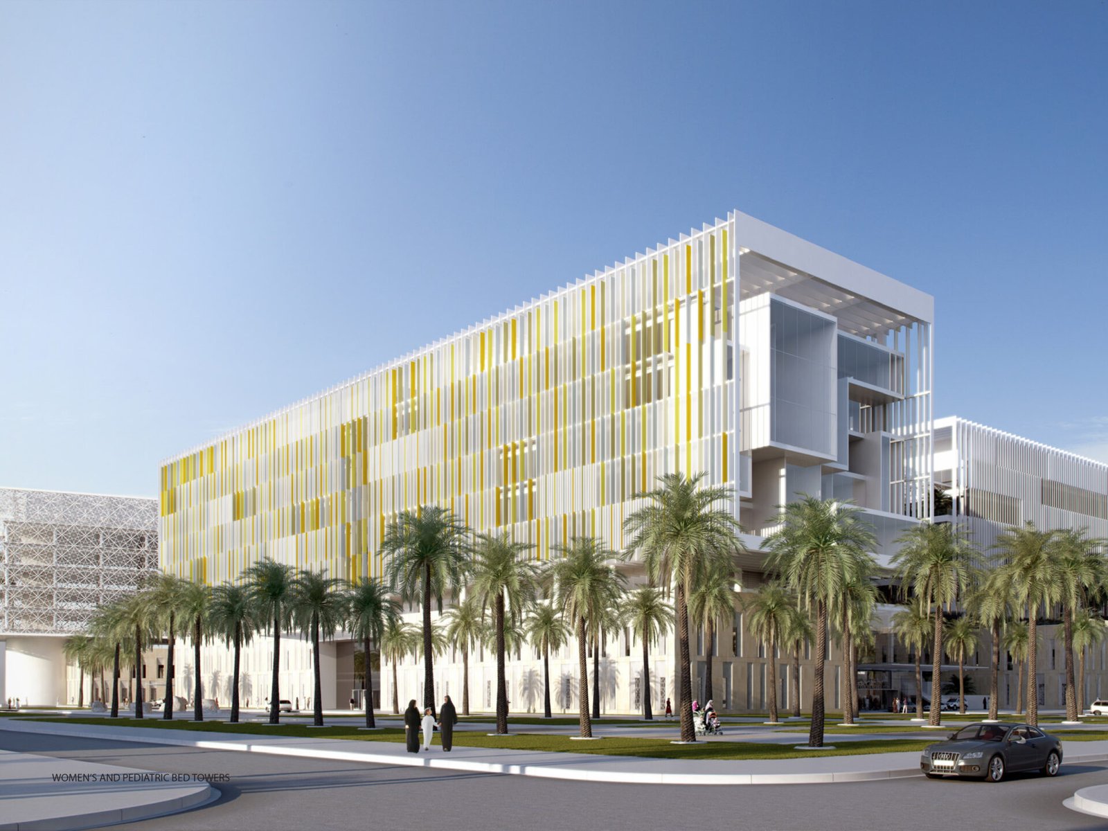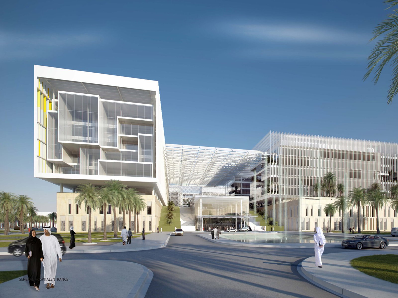 The architecture combines a modernist aesthetic with regional design influences. The building’s footprint consists of geometric glass volumes atop a stone-clad, two-story base. The lower podium level houses critical medical services—including emergency, surgical, and radiology departments—along with amenities like shops and prayer rooms. Patient rooms are located on the upper levels. The overall design emphasizes a feeling of serenity through the incorporation of natural light, materials, and landscaped gardens.