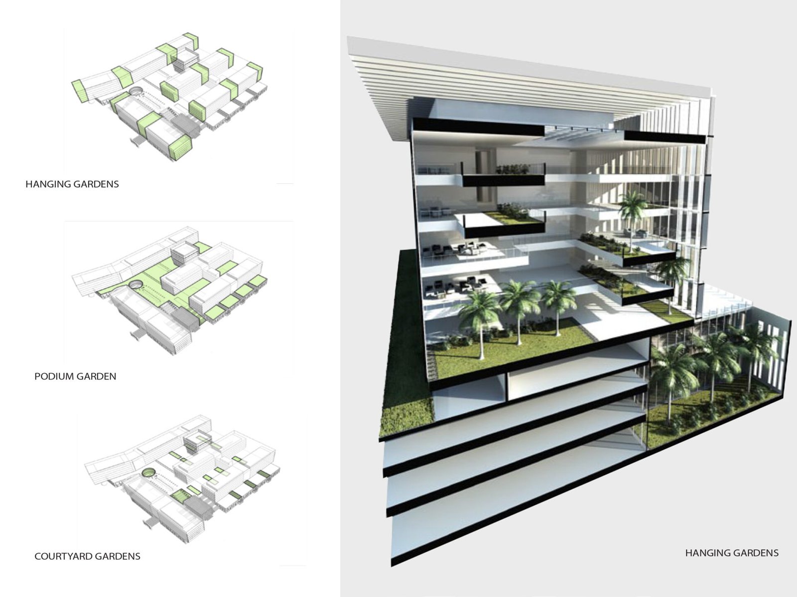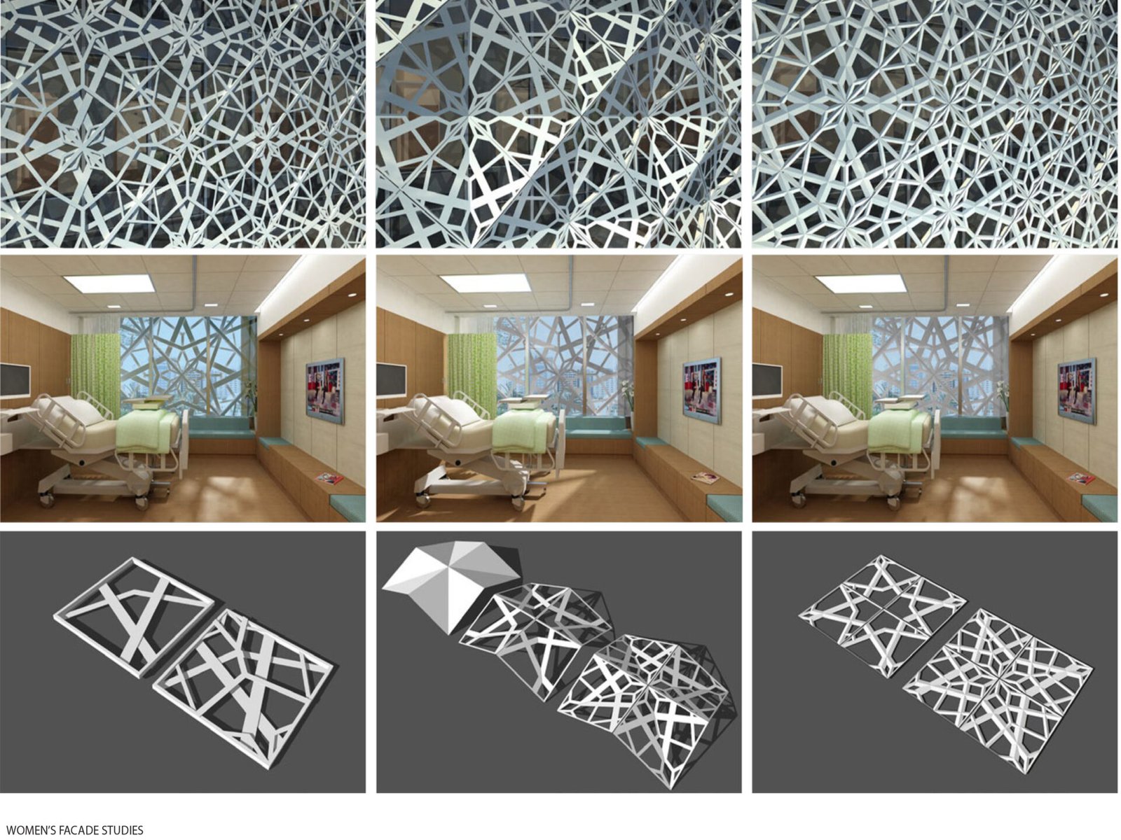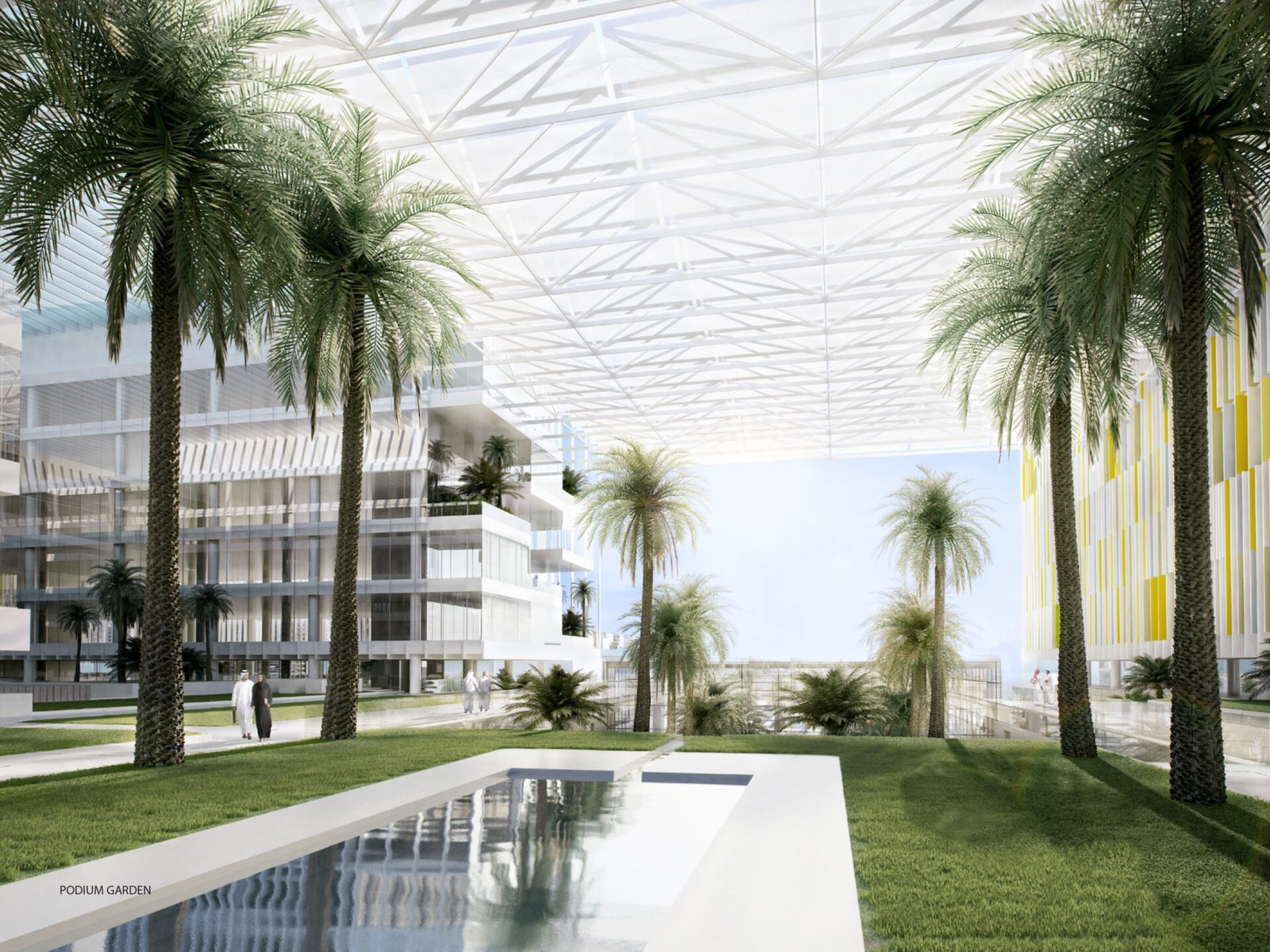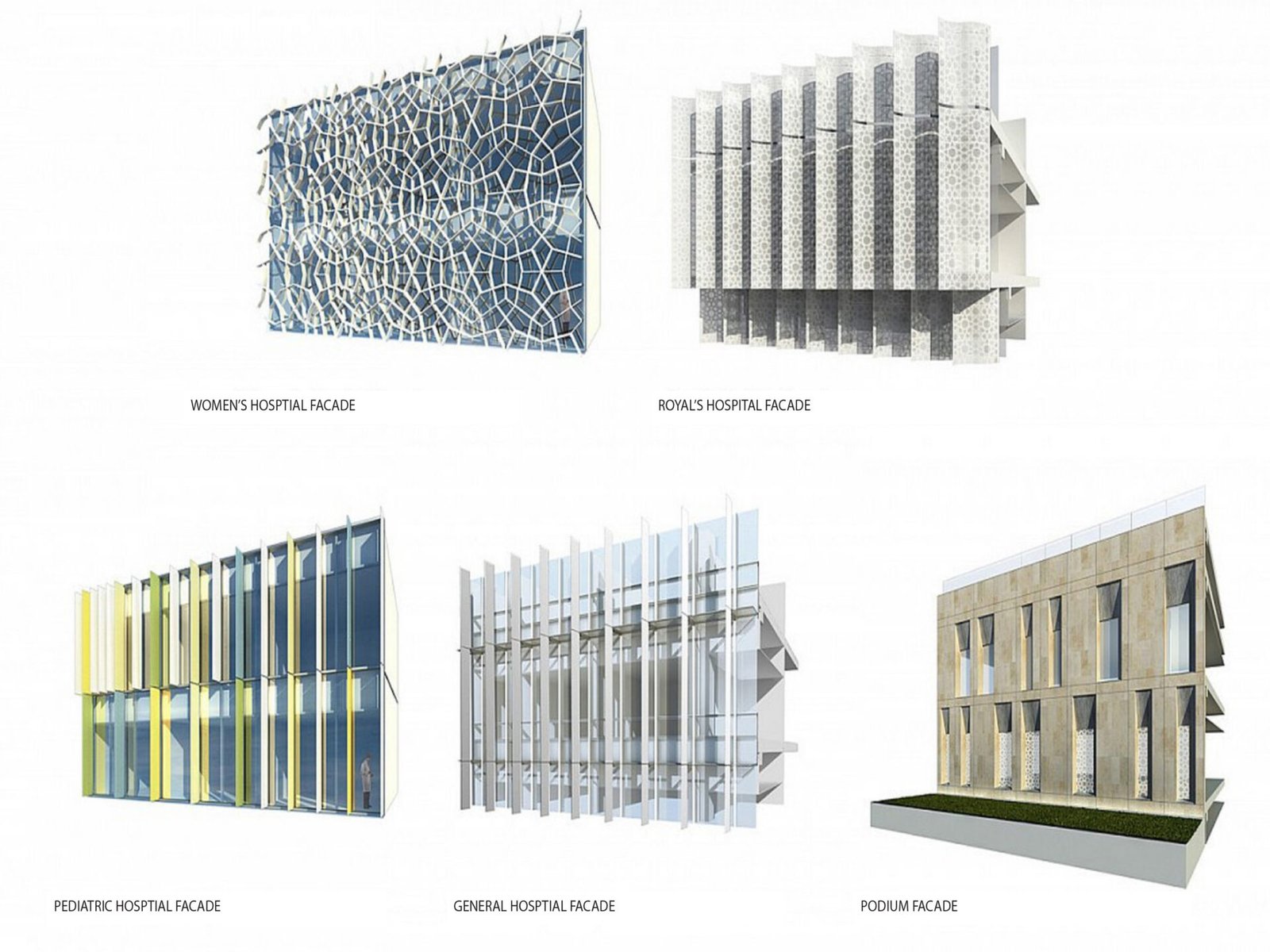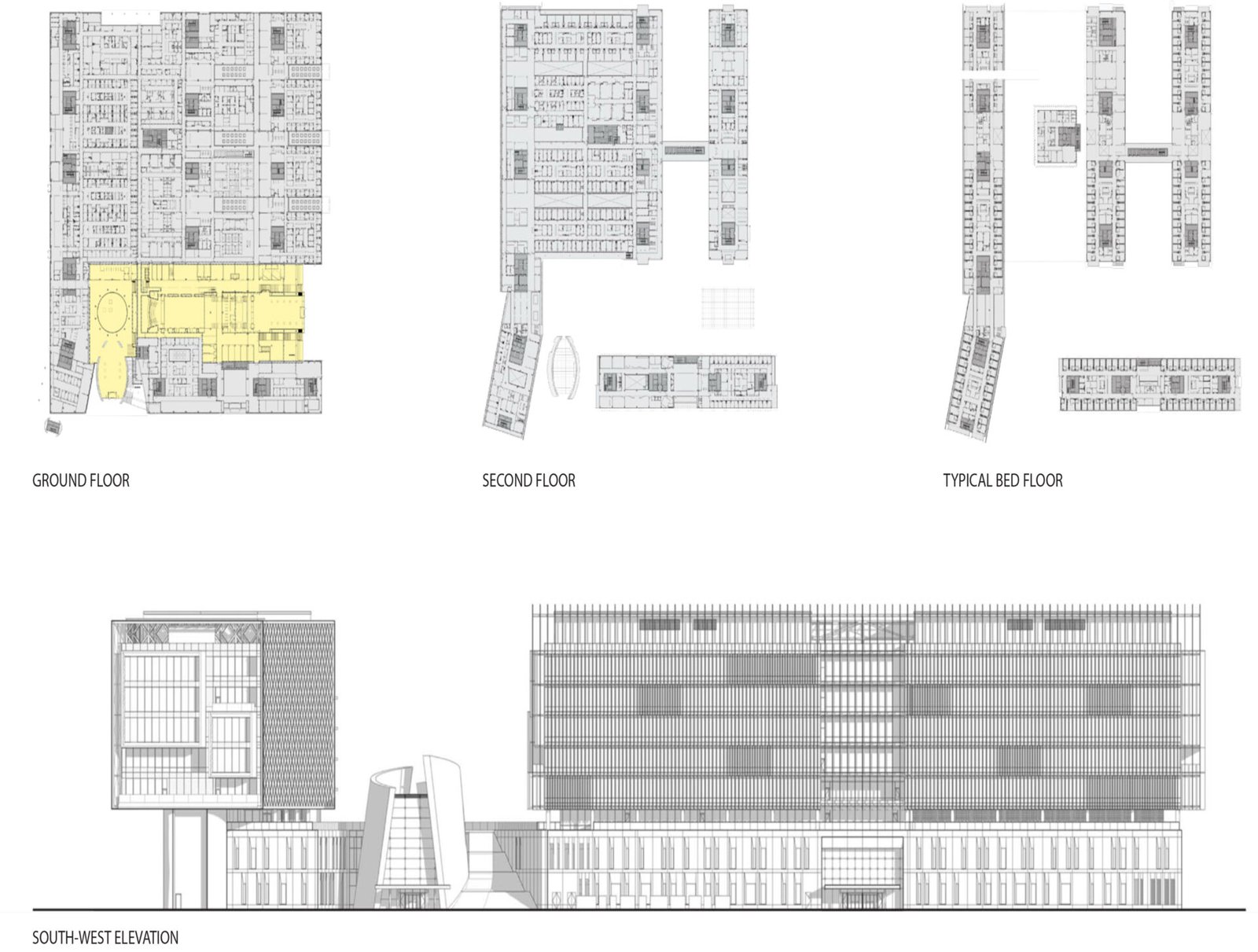 The architecture combines a modernist aesthetic with regional design influences. The building’s footprint consists of geometric glass volumes atop a stone-clad, two-story base. The lower podium level houses critical medical services—including emergency, surgical, and radiology departments—along with amenities like shops and prayer rooms. Patient rooms are located on the upper levels. The overall design emphasizes a feeling of serenity through the incorporation of natural light, materials, and landscaped gardens.